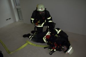 Im Anschluss begibt sich dieser in das Gebäude. Trainiert im Absuchen und schnellen Eindringen begibt sich der Vierertrupp schnellstmöglich zum verunfallten Trupp.